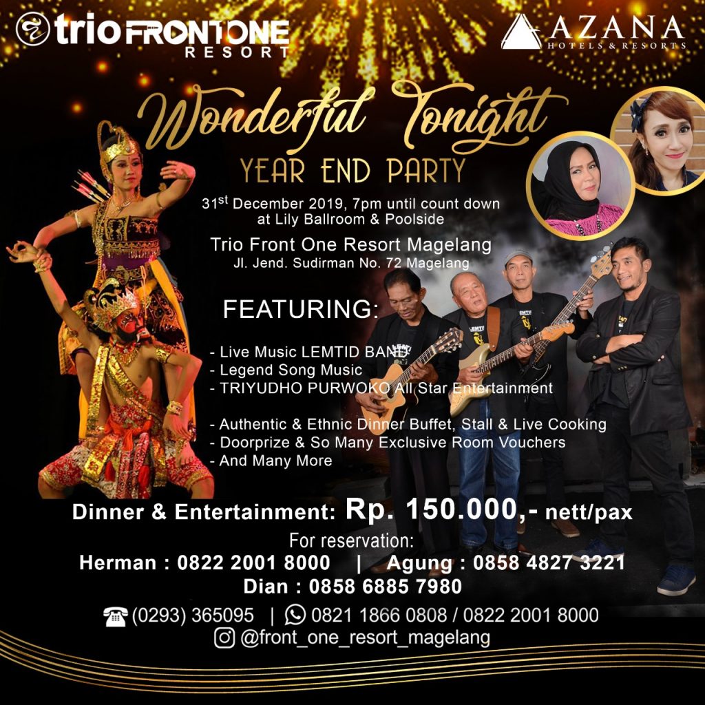 Sedangkan utuk event malam pergantian tahun, kami sudah mengemas acara yang sangat menarik. Dengan tema Wonderfull Tonight Year End Party. Gala Dinner yang di iringi oleh entertaint, mengambil venue di Ballroom. Hanya Rp. 150.000,- nett / pax tamu sudah bisa menikmati sajian menu special dari kami dan juga acara malam pergantian tahun dengan meriah. Untuk tamu yang ingin menginap dan juga ikut acara cukup dengan harga Rp. 785.000,- nett RBF include dinner 2 pax.