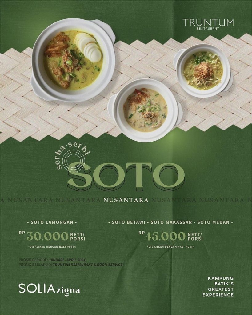 Kabar bahagia untuk sobat semua, sekarang bisa menikmati Soto dengan cita rasa khas Nusantara yang lezat di Solia Zigna Laweyan Solo. Tepatnya ialah Truntum Restaurant menyajikan Serba-serbi Soto berasal dari berbagai daerah di Nusantara mulai dari Soto Lamongan, Soto Betawi lalu Soto Makassar dan juga ada Soto Medan.